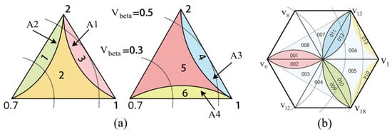 From Table 3, it can be observed that when the switching state is in the zero vectors, ppp or nnn, the CMV reaches its maximum value of . In contrast, when the switching state is in the medium vectors, no CMV is generated. However, if only medium vector switching states are selected, while CMV suppression can be achieved, this leads to excessive current harmonics and NPV imbalance. Reference [65] proposes a strategy that selects a combination of medium vectors and zero vectors, utilizing a total of nine switching states. This method effectively suppresses the CMV to 0. However, it introduces significant harmonic distortion and requires two switching state transitions per cycle, increasing switching losses. Furthermore, this method neglects the use of redundant small vectors, resulting in an inability to effectively control the NPV balance, thereby causing substantial NPV fluctuations. In Reference [66], a control strategy is proposed that selects 15 switching states with a CMV amplitude of 6 with four switching states and a CMV amplitude of 0. This method effectively reduces the CMV to approximately . Moreover, by introducing redundant small vectors, this approach not only reduces the CMV but also provides a degree of control over NPV balancing. However, this method has an inherent issue with output voltage instability. Reference [67] proposes an SVPWM strategy based on a 45° coordinate system to suppress CMV in multi-level converters, which can be applied to three-level converters. The proposed CMV suppression method includes two key strategies: First, an optimized SVPWM strategy based on the 45° coordinate system is introduced. This strategy calculates the minimum common-mode voltage switch state for each space vector, avoiding the need for redundant switch state calculations and effectively reducing the CMV. Secondly, by adding redundant units and compensation units to each phase, the method further adjusts and eliminates non-integer level common-mode voltage, correcting it to integer levels, thus achieving complete CMV elimination. This approach simplifies the calculation process and reduces the computational burden. Reference [68] proposes a minimum CMV pulse-width modulation strategy to reduce the CMV of three-level inverters. The study combines multiple SVPWM sequences and selects the optimal CMV combination in different modulation regions. By utilizing medium and zero vectors, the method generates zero or minimal CMV. Additionally, each sector is divided into different regions, where different sequences are applied based on three modulation indices: high, medium, and low. The specific segmentation method is illustrated in Figure 11. Figure 11a shows that each sector is subdivided into three sub-regions, each corresponding to a different PWM sequence. For example, odd-numbered sectors adopt sequences 1, 2, and 3, while even-numbered sectors use sequences 4, 5, and 6. This approach enables the selection of the optimal sequence within different reference voltage angle regions, thereby minimizing CMV fluctuation. Figure 11b demonstrates the implementation of the hybrid PWM strategy within a hexagonal space, clarifying how different sequences are combined in each sector to reduce CMV. By distinguishing between odd and even sectors, the CMV fluctuation of each sequence is effectively constrained within .