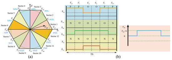 Reference [69] proposed a novel discontinuous space vector pulse width modulation method aimed at reducing CMV. The study first analyzed the vector CMV under unbalanced NPV. By eliminating vectors with high CMV, a new space vector diagram was constructed, in which the three nearest vectors were selected to synthesize the reference vector, thereby minimizing output current harmonics. Subsequently, the subdivision of sub-sectors and the vector sequences were optimized, further suppressing CMV and reducing switching losses. Building upon the SVPWM framework, Reference [70] proposes an improved strategy based on the SVPWM method, known as the modulation technique that utilizes only large, medium, and zero vectors. The core advantage of this method lies in the exclusion of small vectors, which significantly reduces the amplitude of the CMV. Figure 12 illustrates the voltage vector state diagram for this method, where the voltage vector space is divided into several sectors. In this diagram, the large sector is further subdivided into 12 smaller sectors, creating a more refined modulation control to optimize the output voltage and suppress the CMV.