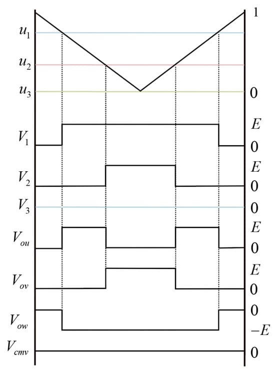 The modulation waveform represents a crucial degree of freedom in achieving CMV suppression, with modulation approaches including zero-sequence voltage injection and modulation waveform decomposition. Zero-sequence voltage injection is a commonly used technique. Reference [77] proposes a CMV suppression method based on modulation waves, as illustrated in Figure 15. In this approach, virtual modulation waves are compared with the carrier wave to generate virtual output voltages , , and , The actual output voltages are then obtained by pairwise subtraction of these virtual voltages. As shown in Figure 15, for each phase with positive and negative output voltage pairs, the three-phase CMV components cancel each other out within each switching cycle, effectively suppressing the CMV to zero.