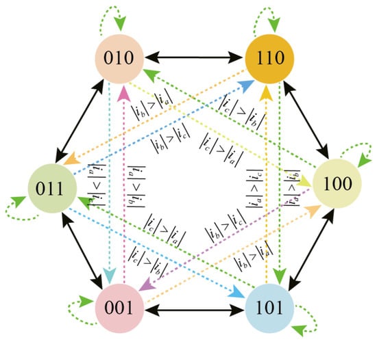With the advancement of artificial intelligence technology, intelligent control has shown increasingly significant effects in suppressing CMV [79]. Reference [80] proposed a novel CMV reduction strategy for inverters based on model predictive control (MPC) and applied it to the control system of permanent magnet motors. In this method, three adjacent space vectors and one non-adjacent space vector were selected as candidate vectors. The switching state diagram is shown in Figure 16. Since each space vector state corresponds to three non-adjacent non-zero space vector states, the switching current of the inverter bridge arms is minimized. Additionally, as zero vector states are not utilized, the CMV is constrained to a maximum value of . By selecting appropriate space vector combinations, this method effectively reduces the amplitude of CMV.