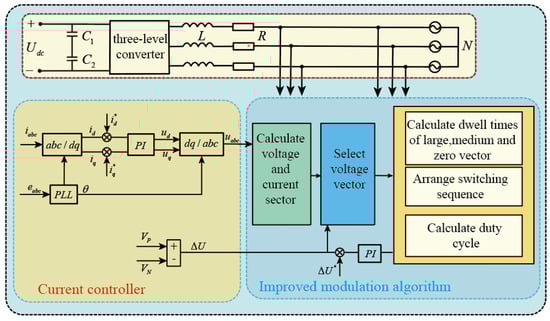 In recent years, many scholars have proposed intelligent control methods, such as model predictive control and sliding mode control, to achieve NPV balance. Compared to hardware-based circuit control, these methods do not require additional electronic power components and do not complicate the control system model, effectively reducing costs. Compared to NPV balancing methods based on SVPWM, intelligent control offers greater flexibility and is more suitable for high-level topologies [56,57,58,59]. As shown in Figure 8, this method employs a closed-loop control approach. First, it collects the three-phase voltages and the DC bus capacitor voltages, and , and then transforms them into the dq-axis voltages and currents, , , and , using coordinate transformation. Subsequently, based on the current error calculation, a PI controller is utilized to regulate the voltage references and . Next, an intelligent control strategy is applied to optimize the switching states, ensuring the balance of the NPV. Through intelligent optimization, the system can maintain NPV balance under various operating conditions.