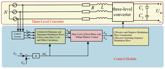 With the gradual depletion of traditional energy sources and the environmental issues it causes, the development and application of renewable energy technologies have garnered significant attention. Pulse width modulation (PWM) technology is widely used in photovoltaic power generation, wind power generation, electric vehicle motor control, and energy storage systems, serving as a key technology to promote the efficient utilization of renewable energy [1,2,3]. PWM technology plays a crucial role in improving system efficiency, extending equipment lifespan, and enhancing the stability of power systems by precisely controlling the energy conversion process. It provides technical support for the efficient utilization and promotion of renewable energy. In this context, the three-level converter, as a core component of PWM technology, enables efficient DC to AC power conversion, further enhancing the overall system performance. It excels in reducing harmonic distortion, minimizing switching stress, improving efficiency, and enhancing output voltage quality, while significantly reducing the need for filtering. The three-level converter demonstrates significant application value in high-power and high-voltage scenarios [4,5,6]. The three-level converter, with its advantages, has been widely applied in the field of power conversion. However, in practical applications, its performance is constrained by common-mode voltage and neutral-point voltage balancing issues. Among these, the neutral-point voltage balancing problem is particularly prominent and has become a key challenge in current research. The DC side of the three-level converter consists of a positive rail, a negative rail, and a neutral point. Ideally, the neutral-point voltage should be maintained at the midpoint between the positive and negative rail voltages to ensure symmetrical output voltage and achieve stable three-level characteristics [7]. Through stepped voltage modulation, three-level converters achieve high-quality energy conversion at relatively low switching frequencies, significantly reducing the harmonic content in the output voltage waveform [8,9,10]. In practical applications, however, due to factors such as asymmetrical operation of switching devices, load current fluctuations, and parameter mismatches in the DC-side capacitors, the NPV often deviates from its ideal stable state [11]. Neutral-point voltage offset can lead to several adverse effects, including the generation of asymmetric output voltage, which causes an increase in harmonic distortion, thereby reducing power quality. The fluctuation of the neutral-point voltage imposes additional voltage stress on the switching devices, increasing the risk of damage. Prolonged imbalance may also result in system instability, severely affecting the safety and reliability of both the converter and the power system [12,13,14]. To address the neutral-point voltage balancing issue, both academia and industry have proposed various solutions, including passive balancing methods based on modulation strategies and active balancing techniques based on circuit structures. For instance, optimizing space vector modulation and carrier phase-shift modulation strategies can effectively suppress neutral-point voltage fluctuations. These methods help achieve a more stable operation of the converter by maintaining the balance of the neutral-point voltage, thereby improving overall system performance and reliability [15,16]. To more effectively stabilize the NPV, some studies have introduced active NPV balancing circuits, which utilize additional hardware structures to monitor and compensate for voltage deviations in real time [17]. Furthermore, optimizing capacitor matching and the design of switching device characteristics have also played pivotal roles in addressing NPV balancing challenges, as these designs fundamentally mitigate the impact of circuit parameter discrepancies on the NPV [18,19,20]. As power electronic devices trend toward higher frequencies and greater power density, the issue of CMV has become one of the critical factors affecting system performance and reliability [21,22,23]. CMV originates from the average voltage of phase lines relative to a common reference point in power electronic systems. Ideally, the phase voltages of a three-phase system or multilevel converter should maintain symmetry and balance relative to the ground [24]. However, in practical operations, CMV is often inevitable due to high-frequency switching operations, asymmetric modulation strategies, device parasitic effects, and complex load environments. Furthermore, the magnitude of CMV tends to fluctuate significantly with increasing switching frequencies [25]. A fluctuating CMV not only affects power quality but may also lead to issues such as electromagnetic interference (EMI), bearing currents, and insulation aging, which can compromise long-term operational stability [26,27]. In motor systems driven by inverters, CMV-induced coupling effects generate bearing currents, accelerating motor bearing wear and shortening motor lifespan [28]. Additionally, CMV forms ground leakage currents through parasitic capacitances in the system. These high-frequency leakage currents are a primary source of EMI, potentially interfering with nearby electronic devices and sensitive components [29]. More critically, persistent CMV imposes extra stress on the system’s insulation layers, increasing the risk of insulation material breakdown and ultimately reducing equipment reliability [30]. Given the widespread application of power electronic devices, the generation mechanisms, impact mechanisms, and suppression strategies for CMV have become important research topics in both academia and industry. In recent years, researchers have proposed various methods to mitigate the adverse effects of CMV. These solutions can broadly be categorized into hardware-based suppression and control strategy optimization. From a hard