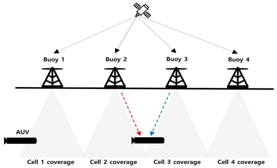 We assume that the surface buoys maintain connectivity with terrestrial base stations and can accurately estimate synchronization, analogous to the 1 PPS (pulse per second) signal from GPS satellites. Furthermore, we consider a situation akin to terrestrial cellular networks, where frequency resources and cell coverage are configured with distance-dependent power assignment to minimize signal interference (Figure 1).