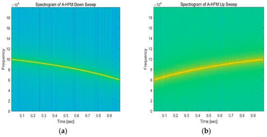 In this paper, we generate two types of A-HFM signals by applying symmetry and frequency translation to both the down-sweep and up-sweep signals. For the A-HFM down-sweep, we create it by first applying frequency-axis symmetry to the existing up-sweep HFM signal and then translating it parallel by . The equations for the time and frequency domain signals of the generated down-sweep A-HFM are given in Equations (6) and (7), and spectrograms are illustrated in Figure 2a.