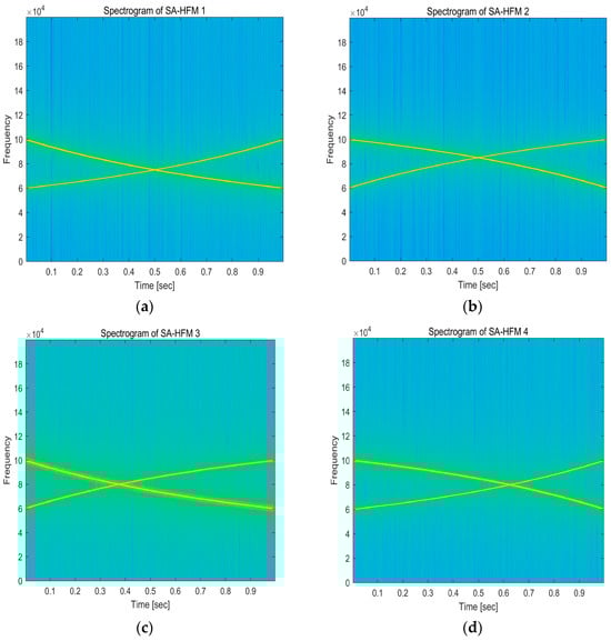 Spectrograms of SA-HFM signals: (a) spectrogram of ; (b) spectrogram of ; (c) spectrogram of ; (d) spectrogram of .