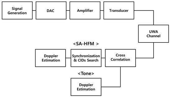 For the tone signals identified at the receiver, the Doppler shift and Doppler spread were examined using the Fourier transform. In the case of the dual HFM signals created by concatenating HFMs with different sweep directions, we applied the cross-correlation method to detect the peak in the received signal and then performed Doppler estimation. For the proposed SA-HFM, we conducted cross-correlation on the received signal to identify the dominant peaks, after which we assessed the performance of CID assignment by comparing CIDs according to the positions of the designed signals. The transmission procedure is illustrated in Figure 4.