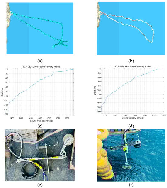 GPS positions of transmitting and receiving vessels, sound velocity profiles, and transceiver sensors on the day of the experiment: (a) GPS coordinates of the transmitting vessel. The path diverging into three branches at the 5 o’clock position represents the routes for collecting results at each center frequency; (b) GPS coordinates of the receiving vessel, which was anchored during the experiment; (c) sound velocity profile at 14:00 on the day of the mobile experiment; (d) sound velocity profile at 16:00 on the day of the mobile experiment; (e) transceiver sensor 1; (f) transceiver sensor 2.