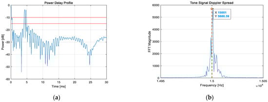 Channel characteristics at 15,000 Hz center frequency, 100 m separation distance, transmitting sensor depth of 100 m, and receiving sensor depth of 5 m: (a) power delay profile under these conditions; (b) Doppler spread based on tone signal.