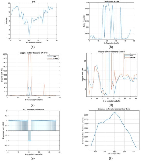 Next, considering a mobile setting, both the transmitter and receiver sensors were placed at a depth of 100 m. The initial inter-vessel distance of 500 m was extended up to 2200 m, with vessel speeds ranging from 1.02 to 1.54 m/s. For a center frequency of 20 kHz, the average maximum delay spread was estimated at 7.91 ms, while the tone-based Doppler effect was measured at 13.8 Hz and the SA-HFM-based Doppler effect at 12.8 Hz. Comparing these results with the theoretical Doppler shift values in Table 2 indicates that the estimated performance was consistent with vessel speeds of approximately 1.02–1.54 m/s. The close agreement between the Doppler shift estimates using the tone and SA-HFM signals reinforces their reliability. However, in terms of the CID assignment performance of the SA-HFM, three missed detections occurred at 15 kHz, likely due to a low SNR during data collection, as shown in Figure 7e. Specifically, when the SNR dropped below −10 dB, the SA-HFM signal could not be detected.