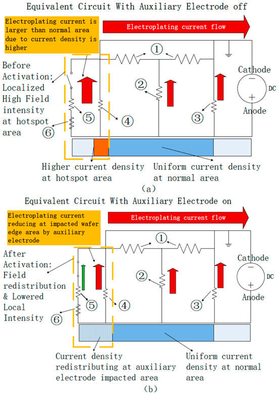 Figure 2a represents the scenario without an active auxiliary electrode, where the current density in hotspot regions, particularly near the wafer edge, is elevated due to localized electric field enhancement. This elevated current density results in excessive deposition rates and significant non-uniformity in copper thickness. The equivalent circuit in this case depicts a direct current path from the anode to the cathode through the plating solution, with uniform solution resistance but concentrated current flow in hotspot regions. In contrast, Figure 2b depicts the situation with an active auxiliary electrode, which introduces an additional current pathway through its direct connection to the electroplating solution. This supplementary pathway enables the auxiliary electrode to shunt part of the current from the anode, effectively reducing the current density in the hotspot regions. Although the solution resistance remains constant, the redistributed current lowers the electric field intensity and deposition rate in the targeted hotspot areas. The equivalent circuit model reflects this redistribution as a decrease in current through the hotspot pathway, demonstrating the auxiliary electrode’s dynamic current-shunting capability. By mitigating localized over-deposition, the auxiliary electrode enhances plating uniformity across the wafer while maintaining stable deposition conditions in unaffected regions, thereby optimizing the overall electroplating process.