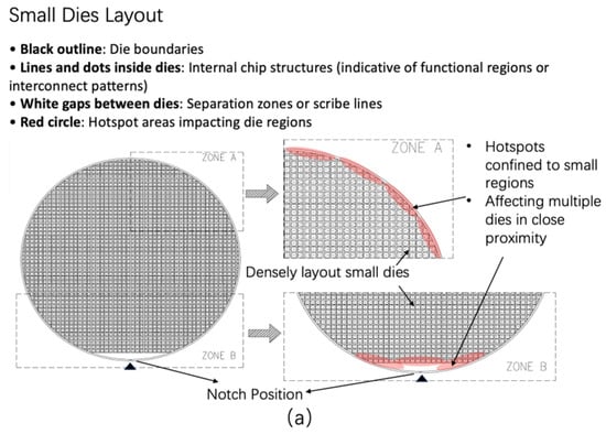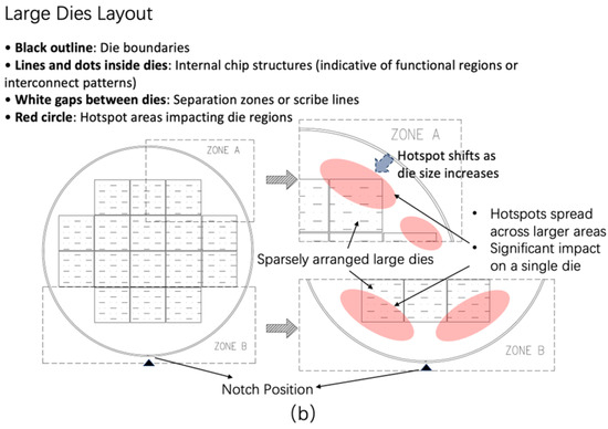 Comparison of hotspot distribution in small die and large die layouts. (a) Small die layout: hotspots (red circle) are localized and primarily affect multiple small dies in dense regions. (b) Large die layout: hotspots (red circle) expand over larger areas, significantly impacting a single large die. The transition from densely laid out small dies to sparsely arranged large dies demonstrates the evolving impact of hotspots on die uniformity and reliability.