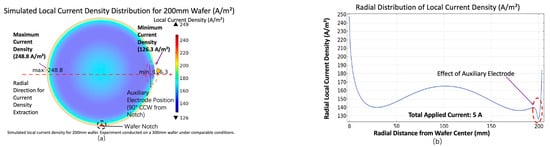 The simulation results for (a) current density distribution on the whole wafer surface (with the auxiliary electrode); (b) radial current density within the wafer.