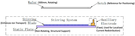 Cross-sectional view of the stirring system and auxiliary electrode placement. The auxiliary electrode is securely fixed to the static plate, with its position precisely aligned using the wafer notch as a reference. This configuration allows for effective localized current redistribution near the wafer edge, while the stirring blade facilitates enhanced ion transport. The design ensures seamless compatibility with existing electroplating systems, optimizing the overall process efficiency.