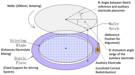 Top-view schematic of the stirring system and auxiliary electrode placement. The top-view schematic highlights the auxiliary electrode’s placement relative to the wafer notch, with the activation angle (θ) enabling targeted current control. The fixed positioning ensures consistent alignment and effective mitigation of current density hotspots, maintaining uniformity across the wafer while supporting high-precision electroplating.