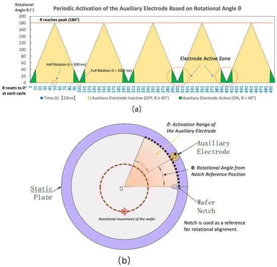 Schematic diagram of the working principle of dynamic angular control. (a) Periodic Activation of the Auxiliary Electrode Based on Rotational Angle; (b) Rotational Alignment Using the Wafer Notch.