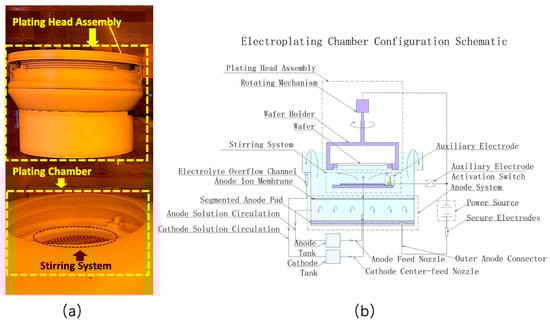 Experimental setup and electroplating chamber configuration. (a) Photograph of the Systech G3 horizontal electroplating platform, showcasing the plating head assembly, wafer holder, and stirring system. (b) Schematic diagram of the electroplating chamber, detailing the segmented anode system, ion membrane, placement of the auxiliary electrode, and electrolyte circulation pathways.
