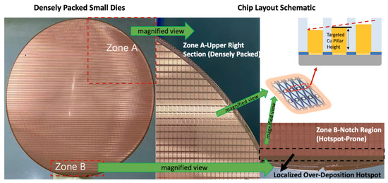 The semiconductor industry is undergoing a transformative shift toward advanced packaging technologies, enabling higher computational power and energy efficiency [1,2,3]. As Moore’s Law slows, the limitations of single-chip integration become apparent, and large-scale chips (LSCs) have emerged as critical components for high-performance computing, artificial intelligence, and data centers [4,5]. Advanced techniques like hybrid bonding and multi-die stacking significantly enhance interconnected structure density, providing innovative solutions to overcome traditional manufacturing constraints [6,7]. Despite these advancements, wafer-level manufacturing of LSCs faces significant challenges. Localized hotspots (LHs) caused by non-uniform current density in wafer-level electroplating (WLEP) exacerbate disparities in the copper pillar and micro-bump heights, especially near wafer edges [8,9,10,11]. This within-die nonuniformity (WDNU) undermines coplanarity, a critical parameter for ensuring packaging precision, mechanical reliability, and signal integrity [12]. As chip sizes increase, their edge regions experience higher current densities, leading to severe height variations that compromise alignment during bonding. Advanced packaging technologies like chiplet interconnected structures, high-bandwidth memory (HBM), and 3D stacking demand stringent uniformity in micro-interconnected structures [13,14,15,16,17,18,19]. However, existing methods, such as annular auxiliary cathodes, lack the dynamic adaptability to address complex LHs.
