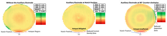 The experiment initially measured the copper pillar height distribution without the auxiliary electrode and generated a height distribution map for the entire wafer (Figure 12a). To ensure data confidentiality while maintaining the integrity of the analysis, all copper pillar height measurements were normalized by dividing each data point by the average value across the entire wafer, resulting in a relative height distribution map. This normalization approach helps to eliminate the minor variations in average thickness that might arise from the process, which could potentially lead to misinterpretations of the results. This normalization method does not affect the overall distribution interpretation and clearly highlights local hotspot trends. Without the auxiliary electrode, a significant over-deposition region appeared near the notch, where the copper pillar height exceeded the average, forming a distinct hotspot due to the non-uniformity caused by the notch layout constraints [30]. When the auxiliary electrode was applied to the notch region, it effectively redistributed the local current density, significantly reducing copper deposition and shrinking the hotspot area (Figure 12b). This demonstrates that the auxiliary electrode can regulate local hotspots at the wafer edge precisely, without compromising overall uniformity. To further assess the dynamic regulation capability of the auxiliary electrode, its position was adjusted from the notch to 90° counterclockwise. At the 90° counterclockwise position, the original hotspot at the notch remained, but copper deposition in the electrode’s influence area was significantly reduced, confirming that the auxiliary electrode’s effect can be flexibly adjusted for different target regions (Figure 12c). The experimental results demonstrate that the auxiliary electrode reduces local hotspots at the wafer edge, improving the uniformity of the Cu pillar height distribution. It can also adapt to changes in hotspot regions by adjusting its operational position, making it a valuable tool for optimizing wafer-level electroplating uniformity, particularly for high-density packaging applications requiring precise control of local hotspots [31].