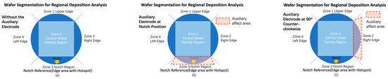 Wafer Segmentation for Regional Deposition Analysis with Auxiliary Electrode Activation: (a) Without the Auxiliary Electrode; (b) With the Auxiliary Electrode at the Notch Position; (c) With the Auxiliary Electrode at 90° Counter-clockwise Position.