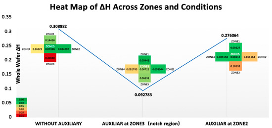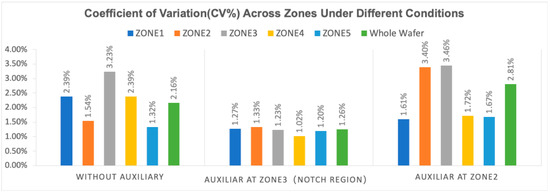 Figure 14 presents the coefficient of variation (CV%) across different zones under varying electroplating conditions, while Figure 15 displays the heat map of ΔH, representing the variation in copper pillar height. These results emphasize the localized impact of the auxiliary electrode and provide quantitative insights into its effect on deposition uniformity. In the absence of the auxiliary electrode, Zone 3 exhibited the highest CV% (3.23%) and ΔH (0.308), establishing it as the primary hotspot due to its proximity to the notch and the inherently uneven electric field distribution. In contrast, Zone 5 demonstrated the most uniform deposition, with a CV% of 1.32% and ΔH of 0.073, indicating its relative insensitivity to edge effects. Zone 2, characterized by initially uniform conditions, showed a ΔH of 0.084, which was comparable to that of the central Zone 5.