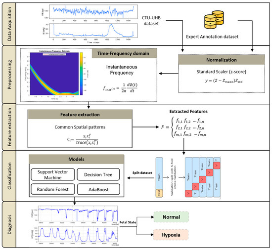 This research aims to develop a CSP-based fetal hypoxia diagnostic system using CTG signals. The system consists of four stages: data acquisition, data preprocessing, feature extraction, and classification. In the preprocessing stage, the CTG signals are normalized, and instantaneous frequency is employed. Then, the features are extracted using the CSP algorithm. Finally, the extracted features will be used to train the classifier; the trained classifier is then tasked to predict whether the CTG signal is normal or hypoxic. Figure 1 illustrates the block diagram of the proposed system.