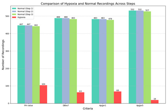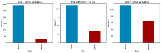 In the experiments of this study, we utilized objective criteria with established clinical thresholds: a post-delivery umbilical artery pH value of <7.15 and a BDecf > 8, both regarded as hypoxia indicators for differentiating CTG signals. In addition, visual evaluations and Apgar scores below 7, signifying hypoxic conditions, have been employed as classification criteria in computational studies. Employing these various classification methods, we examined the distribution of CTG signals in the CTU-UHB dataset, classifying them into normal and hypoxic categories. The distribution of normal and hypoxia classes across the three steps, after applying the clinical thresholds, is shown in Figure 3.