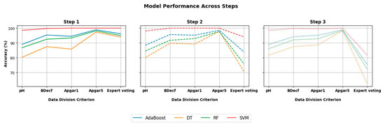 Table 3 illustrates the classification performance of the four classifiers across various objective and subjective data division criteria under Step 3. For the objective criteria (pH, BDecf, Apgar 1, and Apgar 5), the SVM model consistently delivers near-perfect performance, achieving accuracy, precision, recall, and F1-scores at or close to 100%. Similarly, AdaBoost and RF exhibit strong results under these conditions, often recording accuracies above 90% and nearly perfect recall rates. DT, while still relatively effective, lags behind the more complex methods, typically achieving accuracies in the 80–90% range and slightly lower F1-scores. In the scenario defined by the more subjective (Expert majority) criterion, all models show a performance decline. Although SVM retains a strong precision score (0.95), its recall and accuracy drop notably. AdaBoost and RF continue to exhibit balanced performance with F1-scores around 0.75–0.77, while the DT model’s metrics fall further behind with an accuracy of 66.68% and F1-scores of 67%. Figure 5 shows the models’ performance across the three sequential steps in detecting fetal hypoxia under different data division criteria.