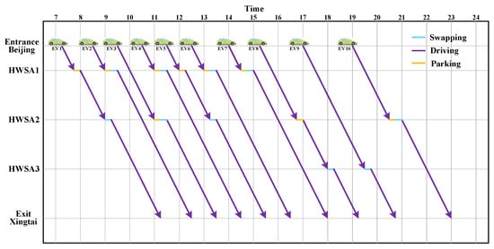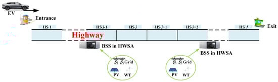 As observed, EV1 enters the highway in time slot . It moves to HS j by selecting several HSs. Then, EV1 does not enter HWSA and instead moves directly from HS j to HS . After that, it passes through four HSs (from to ) and arrives at HWSA . In HWSA , EV1 parks for one time slot and obtains a fully charged battery at the BSS. On the other hand, EV2 enters the highway in time slot . Unlike EV1, it enters HWSA and obtains a fully charged battery in this HWSA. Subsequently, EV2 directly passes through five HSs (from to ) without entering HWSA .