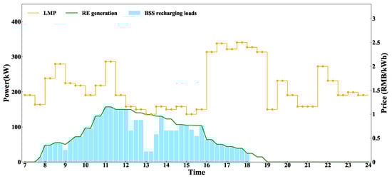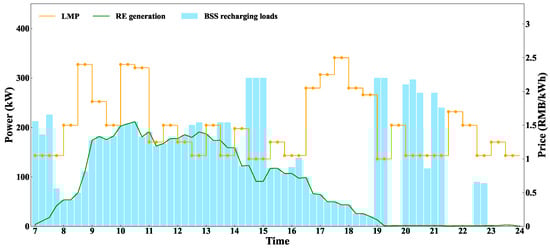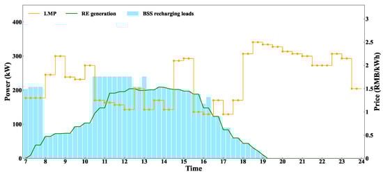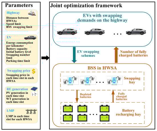 Figure 2 shows the framework of the proposed joint optimization method. Due to business collaborations with the electric sector, the highway operator is assumed to obtain the day-ahead locational marginal prices (LMP). As stated in Section 2, the operator also manages PV and WT devices, and thus is assumed to have access to day-ahead RE generation data. For simplicity, this study does not take into account the uncertainties in RE generation caused by seasonal fluctuations and weather conditions. The price of battery swapping is influenced by factors such as local electricity prices, service fees in the area, and the demand for fully charged batteries from EVs [27]. Based on these factors, operators set the price to maximize their own profits. This study focuses on the optimization for scheduling EVs and managing BSSs. Therefore, it is also assumed that the highway operator has determined the swapping prices at BSSs using a time-of-use pricing approach the day before. Additionally, we assume that EV drivers utilize vehicle-to-network (V2N) technology to provide data on their highway itinerary and battery states [28,29]. In practice, EVs depend on highways for long-distance travel between cities. EV drivers typically use navigation apps, such as AutoNavi Maps, to plan routes and locate energy supply points, and they generally follow these plans. Anticipating future developments, highway operators could collaborate with navigation software providers to incorporate and recommend optimized EV swapping strategies directly through these apps, improving convenience and efficiency for drivers. For example, NIO in China has already partnered with highway operators to implement such a model, helping users plan their EV swapping strategies more effectively [30]. Based on this framework, this study assumes that highway operators provide swapping plans to EV drivers, who are expected to follow these recommendations.