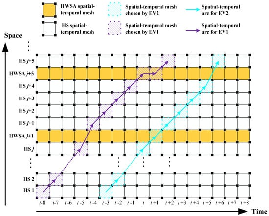 EVs consume their battery energy when an HS spatial-temporal mesh is selected. Each HS spatial-temporal mesh corresponds to a consistent highway distance, indicating the same energy consumption for EVs using these meshes. EVs that opt for an HWSA spatial-temporal mesh are engaged in battery swapping or parking activities in the HWSA. Practically, drivers may park their EVs in HWSAs for various reasons, such as resting or waiting for battery swapping due to limited swapping resources. Therefore, the model incorporates parking for EVs during non-swapping periods. We assume that the EV can complete its swapping process and obtain a fully charged battery in one time slot. This study defines each time slot as 0.25 h. Figure 3 illustrates the behavior of EVs in the spatial-temporal network, using two EVs as examples. The purple arrow traces the spatial-temporal arc of EV1, while the purple dotted box highlights the specific spatial-temporal mesh chosen by EV1. Similarly, the light blue arrow represents the spatial-temporal arc for EV2, and the corresponding light blue dotted box outlines the selected spatial-temporal mesh for EV2.