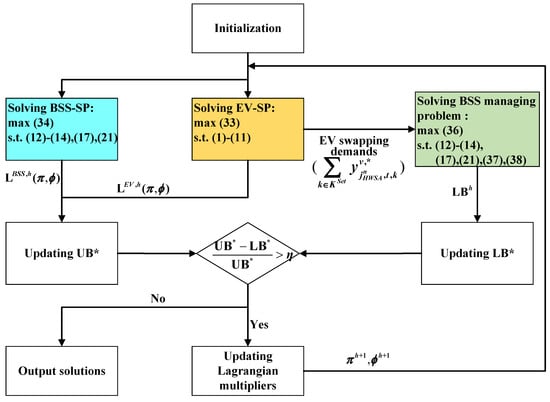 Table 3 provides a structural decomposition of this joint optimization model, revealing that it can be divided into two primary components: EV swapping scheduling and BSS management. Specifically, constraints (1)–(11) pertain to the EV swapping scheduling component, whereas constraints (12)–(14), (17), and (21) are associated with the BSS management component. Notably, coupling constraints (18) and (22) belong to both components. Building on the framework of the model, we apply the Lagrange relaxation algorithm to solve the joint optimization problem. This approach involves multiplying the constraints (18) and (22) by Lagrangian multipliers and incorporating them into the objective function [32]. As a result, the original model is decomposed into two subproblems (EV swapping scheduling and BSS management), which reduces its complexity and makes it easier to solve.