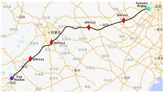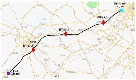 In this study, we introduce a highway system for experimental analysis. As illustrated in Figure 5, the system comprises one highway entrance, three HWSAs, and one exit. The map data presented in Figure 5 are retrieved from Amap [33]. The highway is divided into 14 HSs, each measuring 25 km, resulting in a total length of approximately 350 km. The light blue circle denotes highway entrance Beijing, situated 50 km from HWSA1. The purple circle represents highway exit Xingtai, which is 100 km away from HWSA3. The three HWSAs are represented by red rhombuses. Notably, each HWSA has a BSS. Two HWSAs are located approximately 100 km apart. Given the lower EV traffic during the operational task from 0:00 a.m. to 7:00 a.m., we exclude this period from our analysis. Consequently, the operational horizon is divided into 68 time slots, spanning from 7:00 a.m. to 12:00 p.m.