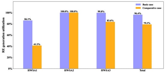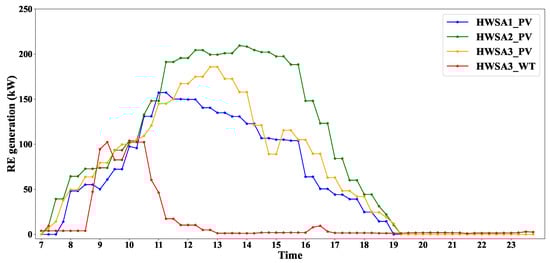 Figure 6 displays the RE generation profiles in each time slot along the highway. The data of RE generation are based on [34,35]. We assume that all HWSAs are equipped with PV devices, whereas HWSA3 additionally features WT. The installed capacity for both PV and WT devices in these areas is set at 300 kW. The disparities in RE generation profiles can arise due to variations in solar radiation and weather conditions, which are influenced by the geographic distribution of HWSAs along the highway. For example, during the period from 14:30 to 16:00, HWSA1 experiences cloudy conditions, while HWSA2 benefits from ample illumination.