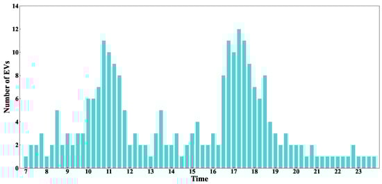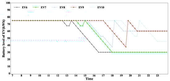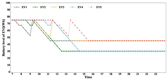 The basic parameter settings for EVs and BSSs are illustrated in Table 4. The parameters of EVs are modeled on the specifications of the NIO ET5, which features the battery-swapping function [36]. As discussed in Section 3.3, the remaining charge level of depleted batteries swapped out of EVs at the BSS in various HWSAs is determined solely by the distance between the HWSA and the highway entrance. Specifically, this charge level is calculated by subtracting the energy consumed by the battery during travel from the highway entrance to the respective HWSA from the EV’s initial battery level. Moreover, the cost of fully charged batteries in the initial time slot at the BSS in different HWSAs is influenced by the above-mentioned remaining charge level of the depleted batteries and BSS service fees. The cost of fully charged batteries in the initial time slot at the BSS is RMB 39.375 in HWSA1, RMB 61.875 in HWSA2, and RMB 78.75 in HWSA3.