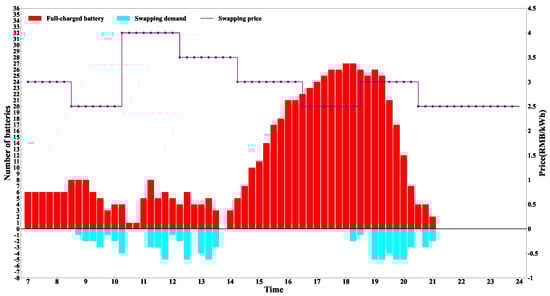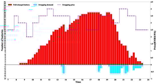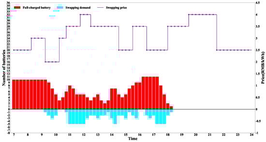 In time slot t within HWSA n, the integer variable represents the number of fully charged batteries stored in the swapping bay, while the integer variable denotes the number of depleted batteries in the same bay. Equation (15) illustrates how the number of fully charged batteries at the BSS changes during time slot t. indicates the total number of newly added fully charged batteries in time slot t (). T defines the number of the time slot. Additionally, defines the swapping demands in time slot t in HWSA n. Notably, the integer variable represents the initial number of fully charged batteries.
