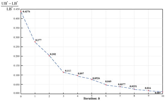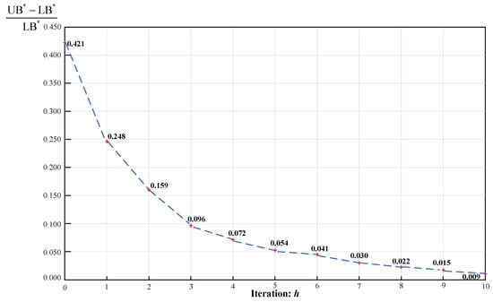 The BSS-SP is formulated as an MIQCP model, which can be directly solved using a commercial solver. Given a set of Lagrangian multipliers , the value of the Lagrangian relaxed problem offers an upper bound (UB) calculated by Equation (35) for the joint optimization problem. The integer variable h indicates the iteration number.
