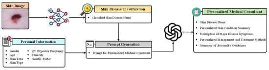 The overall structure of the system proposed in this paper is shown in Figure 1. This system focuses on effectively analyzing the user’s skin condition and providing personalized care methods. First, the user takes a picture of their skin and inputs personal information (e.g., age, gender, skin type) into the system. The inputted skin image is first analyzed by a skin disease classification model, which applies the latest deep learning technology to classify skin diseases with high accuracy. Subsequently, the system combines the classified disease information with the user’s personal information to generate a prompt to be inputted into a GPT-based language model. This prompt is composed to reflect the user’s specific situation and skin condition and is passed to the latest GPT model. The GPT model, based on the inputted prompt, recommends a skin care method optimized for the user’s situation. This process provides users with practical and personalized medical information, thereby helping them achieve more effective skin care and treatment. The following sections provide a more detailed explanation of each component.