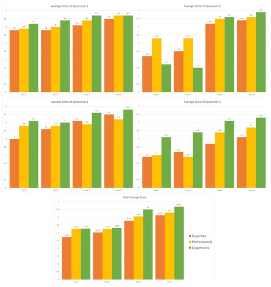 Figure 3 presents the average scores for each question, categorized by participant group: laypersons, medical professionals, and dermatology experts.