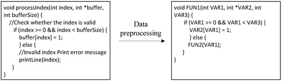 To avoid the issue of a sharp increase in the feature space dimensions, which could lead to higher model complexity and the risk of overfitting when directly using raw names, in this study, we standardized the program code by removing non-ASCII characters and comments and mapping the variables and function names within functions to symbolic names (e.g., ‘FUN1’, ‘FUN2’, ‘VAR1’, ‘VAR2’). By removing these characters, the impact of noise in the input data on the model is reduced; this allows the model to focus more on the effective code logic, ensuring consistency in the input data and simplifying subsequent processing. The effect of data preprocessing is shown in Figure 3.