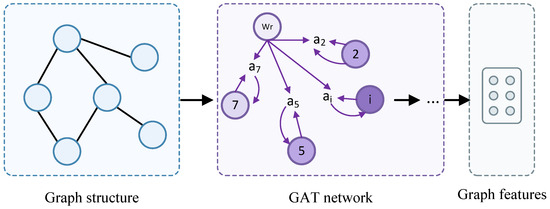 Since the introduction of GNNs, they have been widely applied to process graph-structured data. The core idea of GNNs is to generate new representations of nodes by aggregating the features of nodes and their neighboring nodes. Depending on the aggregation strategy and information propagation mechanisms, various GNN models have been developed, such as Graph Convolutional Networks (GCNs), gated graph neural networks (GGNNs), and Residual Gated Graph Convolutional Networks (RGGCNs). In contrast, GATs introduce an attention mechanism, allowing each node to adaptively assign different weights when aggregating the features of its neighboring nodes. This flexible weight allocation mechanism means that GATs perform excellently in handling complex, heterogeneous, and non-uniform graph data. Therefore, in this paper, a GAT is chosen to extract features from the joint graph structure of the input graph , where V and E represent the set of all nodes and the set of all edges in the joint graph, respectively. The process of graph feature extraction is shown in Figure 5.