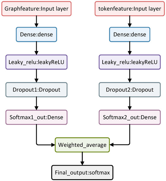 Feature fusion in a neural network model. Two types of input features, Graphfeature and tokenfeature, are separately processed through individual dense layers followed by Leaky ReLU activation and dropout regularization. Each pathway culminates in a softmax output layer, where the individual outputs are combined using a weighted average. The fused result is then passed to the final softmax layer for classification, producing the final output. This process allows for the integration of multiple feature types to enhance model performance.