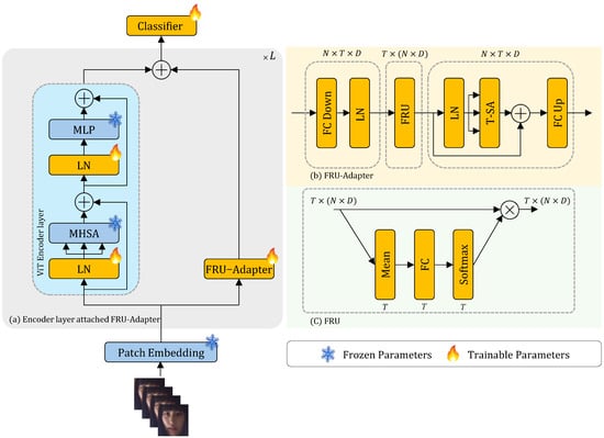 Let us consider a video clip , where T is the number of frames, C is the number of channels, H is the height, and W is the width. As shown in Figure 1, we feed the video clip V into patch embedding. Each frame of V is mapped and flattened into a D-dimensional latent space divided into patches. We refer to the embedded V as . X is combined with the CLS token and then fed into the vision transformer (ViT) encoder pre-trained on large-scale face images and the frame recalibration unit adapter (FRU-Adapter) as follows: