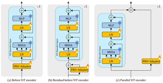 Previous studies [24,25] adopted the method of attaching a temporal feature extraction adapter in front of an encoder layer pre-trained on a large-scale image dataset. However, these methods damage the spatial features, which have a rich generalization ability due to the temporal features injected in front of them. Therefore, we designed the FRU-Adapter to be integrated in parallel with the encoder layer to reduce the loss of spatial features. As illustrated in Figure 1a, a single FRU-Adapter is integrated in parallel for each encoder layer. Given an input at the l-th ViT encoder, the l-th FRU-Adapter is added in parallel with the ViT encoder layer as follows: