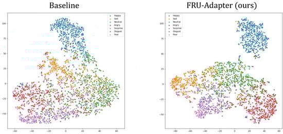We added the FRU-Adapter to the baseline model and used t-SNE [50] to visualize the high-level features of the DFEW dataset. Figure 3 illustrates that the proposed FRU-Adapter significantly improves the discriminative and separable qualities of the high-level features compared to these properties under the baseline model. Compared to the left figure (baseline), the feature distribution of each category in the right figure (FRU-Adapter) is more concentrated, especially for Happy, Angry, and Sad, which exhibit a more distinct boundary than that of the other emotional expressions. These observations demonstrate that the FRU-Adapter appropriately captures the facial changes for each emotion.