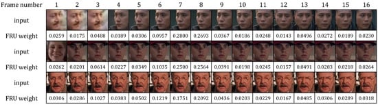 As shown in Figure 1c, the FRU consists of the mean operation, the fully connected layer, and the softmax activation function. Given an input at the FRU, each frame has a global representation by averaging over the dimensions, including N and D. The global representation set of all frames is passed through a linear layer and takes softmax to obtain the relative importance of each frame. Subsequently, X is multiplied element-wise by to recalibrate and emphasize important frames and suppress irrelevant frames. The calculation for the FRU is formulated as follows: