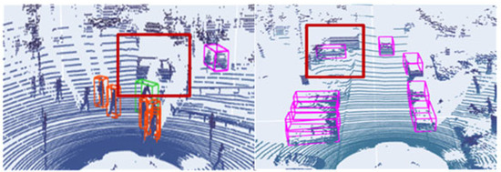 Missed occluded target. The colored 3D boxes represent different detected targets by the model. Green boxes denote “Cyclist”, orange boxes represent “Pedestrian”, and pink boxes indicate “Car”. The red 2D boxes mark the occluded targets that were missed by the detection.