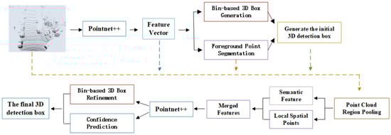 PointRCNN [44], as a milestone study in the field, introduces a two-stage detection strategy with significant contributions. The strategy utilizes the PointNet++ architecture in the first stage to extract per-point features from the point cloud and segment the foreground points accordingly, generating preliminary 3D detection boxes. In the second stage, the generated 3D detection boxes are transformed into the local coordinate system and combined with the segmentation features to achieve refined classification and regression analysis of the preliminary detection boxes.