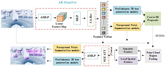 In the first stage, the original point cloud is fed into the feature extraction layer AR-PointNet. The AMLP layer extracts point-level features of 16 dimensions, 16 dimensions, and 32 dimensions, respectively, through MLP1, MLP2, and MLP3, which are then concatenated to form a point-level latent feature map. This vector is fed into the corresponding attention convolutional layers, resulting in attention features of 64 dimensions. These features are then mapped to 32 dimensions using multi-layer perceptrons (MLPs). Subsequently, these features are input into the CA-Res residual module, which aims to avoid potential damage to the model’s generalization ability caused by an increase in model parameters and depth. The point-level feature vectors extracted by the feature module are then passed through the foreground point segmentation module, which segments the foreground points while generating coarse-grained 3D bounding box proposals from the foreground points.