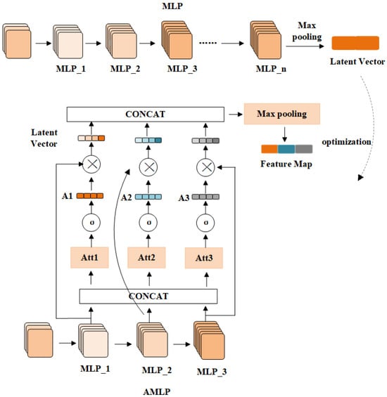 To retain the results of each dimensionality increase in point cloud features and to afford local features the attention they deserve, we propose the Adaptive Multilayer Perceptron (AMLP) method. This method employs a strategy of channel concatenation for the three-level dimensionality-increasing features, feeding them into three separate channel attention modules. It automatically learns the importance of each layer’s features and dynamically assigns weights to them.