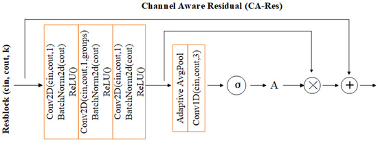 In response to the limitations of traditional residual modules in improving performance, we proposed a novel Channel Aware Residual module (CA-Res), which consists of three residual layers and an ECA-Attention [62] component, with its detailed structure shown in Figure 5. The first residual layer in the residual block includes a 2D convolutional layer, a BatchNorm2d layer, and a ReLU activation function, which is used to perform a 4-fold upsampling of the feature map. The second residual layer performs grouped depthwise convolution, where the number of groups in the convolution operation equals the number of input channels, combined with a BatchNorm2d layer and a ReLU activation function, aiming to reduce the number of parameters and improve computational efficiency. The third residual layer consists of a 1 × 1 2D convolutional layer, a BatchNorm2d layer, and a ReLU activation function, which is used to downsample the feature map.